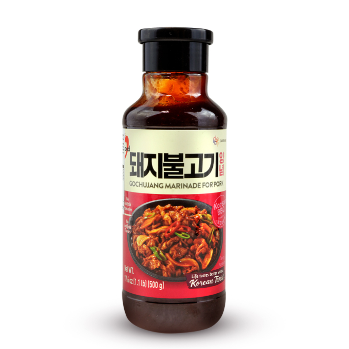 Ingrediente: Gochujang (sirop de tapioca, apă, orez brun, pudră de ardei roșu, sare, alcool, soia, usturoi, ceapă), zahăr, apă, condimente de ardei roșu (pudră de ardei roșu, apă, sare, usturoi, ceapă), sare, extract de drojdie , alcool (pentru a păstra prospețimea), usturoi, pulbere de drojdie (extract de drojdie, dextrină), amidon de porumb modificat (E1422), ghimbir, intensificator de aromă (E627, E631), culoare (E160c), pudră de piper negru, regulator de aciditate (E330) , capsulă oleorezină, îngroșător (E415)